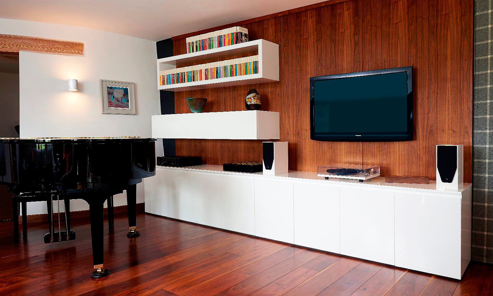 Having had Mounts Hill Woodcraft design and manufacture a kitchen for their oast house, our client asked us to create a media unit and bookshelf to match. We created a sleek modern Parapan cabinet in the same style and colour and a box style bookshelf with hidden fixings, which lends itself to the display of a wonderful selection of colourful books.